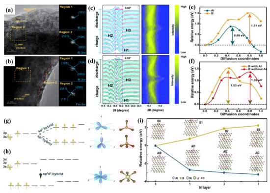 Guo et al. [78] synthesized Al/B co-doped Ni-rich cathode materials (Li(Ni0.88Co0.09Mn0.03)0.985Al0.005B0.01O2, NCM-AB) via solid-state reaction. B dopant has a tendency to form sp2 or sp3 orbital hybridization with the lattice oxygen in NCM (Figure 7g). It shows a triangular configuration (BO3) or tetrahedral configuration (BO4) which are different from the TMO6 octahedron configuration in NCM. Since the radius of B ions is much smaller than that of TM cations, the doping of B at the interstitial position will lead to lattice distortion that hinders the diffusion of lithium ions in the bulk. On the other hand, the 3s and 3p orbitals of Al could hybridize with the d orbital, and the sp3d2 orbital hybridization coordinates with the lattice oxygen to form AlO6 octahedron, which is similar to octahedron TMO6 (Figure 7h). Density functional theory calculations show that Al preferentially binds to oxygen and the diffusion barrier of Al is much lower than that of B (Figure 7e,f). When Al preferentially occupies the sites, it prevents the massive diffusion of B in the bulk phase. The energy of Al on the surface is much higher than that in the inside layers. In contrast, B is stable on the surface and possesses much lower energy than that of the inside layers (Figure 7i). Therefore, the formation of B-rich surface and Al-rich bulk contributes to the cooperative stabilization of the bulk structure and surface chemical stability of cathode materials. NCM-AB shows excellent capacity retention during the cycling process. Precisely controlling dopant site and depth in the cathode material contributes to inhibition of the adverse bulk phase transformation and surface reconstruction during the high-voltage cycling. This work shows that co-doping is a rational approach for developing high-performance electrode materials, which could also help to carry out related studies about new co-dopant chemistry.