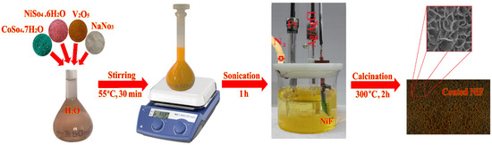 One efficient strategy to improve the energy-storage capacity of a supercapacitor is to incorporate various binary or ternary metal oxides or hydroxides such as Ni–Co [32,33], Co–V [34], Co–Al [35], Al–Mn–Co [36], Ni–Co–Mn [37,38], Zn–Ni–Co [28], and oxides or hydroxides. The growth of novel 2D nanosheets consisting of oxides of Co, Ni, and V was thereby expected to increase the number of electrochemical sites, resulting in a highly efficient supercapacitor. In a CoxNiVyOz-based electrode, Co element improves the conductivity; Ni element can increase the specific capacity on increasing the active site density. V element offers excellent electrical conductivity due to its wide potential windows and satisfactory electrochemical performance that can result in improved capacitive performance of a device [39]. The optimized electrochemically synthetic procedure of CoxNiVyOz crochet nanosheets beautifully grown on a Ni Foam surface is illustrated in Figure 1; detailed information of all preparation and deposition steps is presented below.
