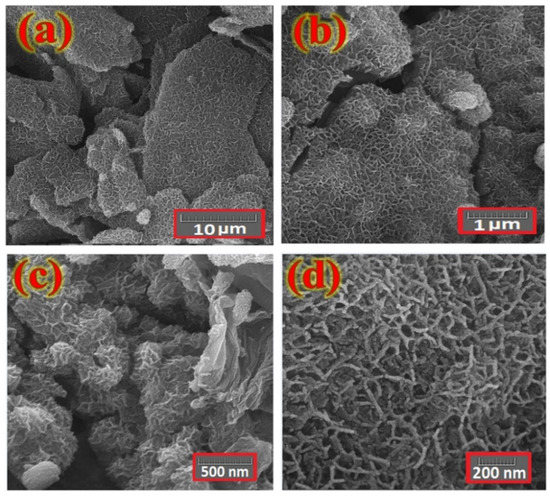 FE-SEM images of a typical CoxNiVyOz layer coated on a Ni foam substrate at various magnifications. (a) 10 , (b) 1 , (c) 500 nm, (d) 200 nm.