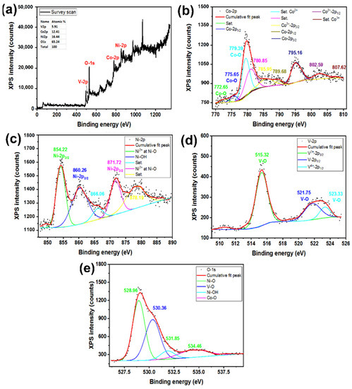 Figure 6 and Figure 7 present XPS of the samples. The XPS origins are specified according to the literature [45,48,49,50,51]. The survey scan in Figure 6a for a CoxNiVyOz sample coated on Ni foam indicates the existence of the desired elements in corresponding binding energies (the inset table also presents the elemental distributions). Ni shows only oxidation state Ni2+ (Figure 6c), but Co and V present varied oxidation states (Figure 6b,d). These results indicate the formation of an oxide phase for elements Co, Ni, and V, confirming the formation of the CoxNiVyOz nanostructure. The O-1s binding energies (Figure 6e) also confirm the existence of Co, Ni, and V in oxide states.