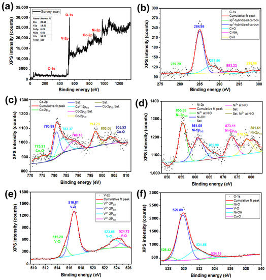 XPS of a CoxNiVyOz layer coated on a Ni foam@rGO substrate, (a) survey scan, (b) C-1s, (c) Co-2p, (d) Ni-2p, (e) V-2p, and (f) O-1s.
