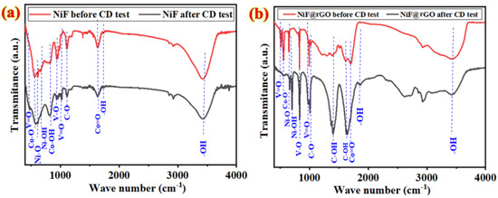 The FTIR results confirmed the formation of a Co–Ni–V oxide structure deposited on the electrode surface. The lines observed at 1460 and 1628 cm−1 in Figure 11b are associated with C–OH vibrations. The stretching modes of carbonyl (C=O) and epoxy groups (C–O) also appear at ~1728 and ~1061 cm−1, respectively. As Figure 11a shows, the CoxNiVyOz-based electrodes deposited on a Ni foam substrate before and after electrochemical tests exhibit similar spectra. The intense line about 1537 cm−1 of Figure 11b is attributed to the skeletal vibration of the graphene sheets, but those lines ascribed to oxygen-containing functional groups were weakened in FTIR spectra of the CoxNiVyOz-based electrode deposited on the Ni foam@rGO substrate after 5500 consecutive charge–discharge cycles in KOH, revealing that these functional groups were partially removed during reduction; most GO was thus transformed into rGO.