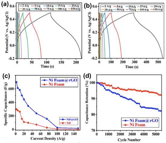 We performed GCD tests for the substrates (Figure S3, Supplementary Materials), and coated electrode materials onto various substrates (Figure 12). The nonlinearity of GCD curves at current density varied in the range 2 to 150 A g−1 indicates a quasi-reversible ion transfer between electrode materials and electrolyte. The GCD test results revealed that the compound coated on the Ni foam@rGO substrate exhibits improved electrochemical performance, which is consistent with the cyclic voltammetry presented above. A possible reason is the availability of a large portion of the inner surface area with an outer electrolyte that can ultimately serve as an easy ion-transport path to decrease the inner-pore resistance. The results demonstrated that on increasing the current density, the discharge duration decreases. The electrode prepared on the Ni foam@rGO substrate delivered specific capacitances 701.08, 613.42, 584.28, 503.57, 444.85, 348.85, 237.85, 157.50, 25.71, and 17.14 F g−1 at current densities 2, 5, 10, 15, 20, 30, 50, 75, 100, and 150 A g−1, respectively, within a potential range from -0.2 to 0.5 V during charge–discharge curves based on the total mass of active material (calculated data are listed in Table S2, Supplementary Materials). The specific capacitance of the electrode coated on the Ni foam substrate is as great as 300.31 F g−1 at current density of 2 A g−1 but decreases to 2.14 F g−1 at 150 A g−1. As expected, the electrode prepared on the Ni foam@rGO substrate has a much greater specific capacitance because of the greater surface area than the electrode assembled on a bare Ni foam substrate. The abrupt decrease of capacitance of samples at large current density is related to the decreased electrical conductivity.