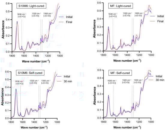 The representative FTIR spectra of experimental core build-up material (S10M6) and MF upon light-curing and chemical-curing. Peaks at 1300 and 1320 cm–1 [ν (C-O)] and 1636 cm–1 [ν (C=C)] of methacrylate groups [51] were reduced upon polymerization.