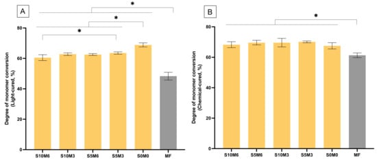 Degree of monomer conversion upon (A) light-activation and (B) chemical activation. Stars indicate p < 0.05. Error bars are SD (n = 5).