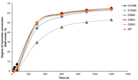 For chemical-activated DC, the highest and lowest values were detected from S5M3 (70.1 ± 0.5%) and MF (61.3 ± 1.4%), respectively (Figure 3B). The DC of MF was also significantly lower than that of all experimental materials (p < 0.05). The DC amongst S10M6 (68.3 ± 1.7%), S5M6 (69.6 ± 1.3%), S10M3 (69.6 ± 2.5%), S5M3, and S0M0 (67.5 ± 1.9%) were comparable (p > 0.05). The self-cured DC of the experimental materials increased more rapidly than that of MF (Figure 4). Additionally, the factorial analysis indicated that the increase of MCPM slightly reduced DC upon chemical activation by approximately 1.3 ± 0.9%, whilst the effect from increasing Sr/F-BGNPs concentration was negligible.