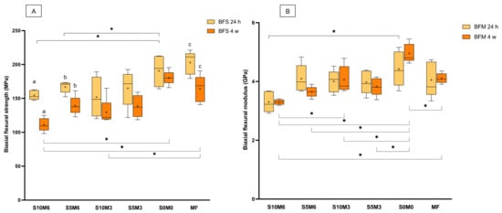(A) Biaxial flexural strength and (B) biaxial flexural modulus of materials at 24 h and 4 weeks. The boxes indicate the first quartile (Q1) to the third quartile (Q3), the horizontal line in the boxes represents the median, the whiskers represent the maximum and minimum values, and “+” represents the mean value (n = 5). The same letters represent p < 0.05 of the data compared within the same materials at 24 and 4 weeks. The dashed and solid lines with stars indicated p < 0.05 of data compared among different materials at 24 h and 4 weeks, respectively.