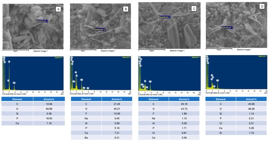 The elemental composition of (A) MCPM and (B–D) calcium phosphates containing F or Sr in the fracture surface of the representative specimens. The calcium phosphate precipitates were only observed in the specimens containing MCPM and Sr/F-BGNPs.