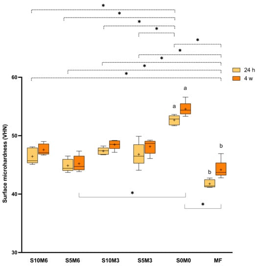 Vickers surface microhardness (VHN) after immersion in deionized water for 24 h. The boxes represent the first quartile (Q1) to the third quartile (Q3), the horizontal line in the boxes represents the median, the whiskers represent the maximum and minimum values, and “+” represents the mean value (n = 5). The same letters represent p < 0.05 of the data compared within the same materials at 24 h and 4 weeks. The dashed and solid lines with stars indicated p < 0.05 of data compared among different materials at 24 h and 4 weeks, respectively.