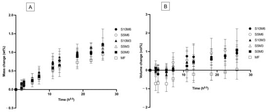 Plots of (A) mass change and (B) volume changes versus immersion time (square root of an hour) for all materials after immersion in de-ionized water for up to 8 weeks. Error bars are SD (n = 5).