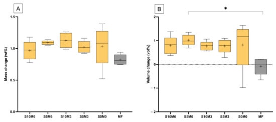 The volume of specimens was slightly changed after immersion in the water early (Figure 9B). At the late time, the lowest volume change was obtained with MF (−0.09 ± 0.36 vol%), which was significantly lower than that of S5M6 (1.02 ± 0.24 vol%) (p = 0.0277) (Figure 10B). The volume change of S5M6 was comparable to that of S10M6 (0.79 ± 0.238 vol%) (p = 0.9792), S10M3 (0.77 ± 0.19 vol%) (p = 0.9710), S5M3 (0.77 ± 0.30 vol%) (p = 0.9706), S0M0 (0.82 ± 1.04 vol%) (p = 0.9876). The factorial analysis indicated no significant effect from rising MCPM and Sr/F-BGNPs concentrations on volume changes of the materials.