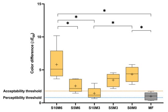 Color difference (∆E00) of all material after immersion in water for 1 week. The boxes represent the first quartile (Q1) to the third quartile (Q3), the horizontal line in the boxes represents the median, the whiskers represent the maximum and minimum values, and “+” represents the mean value (n = 5). Stars indicated p < 0.05.