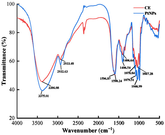 The FT-IR spectra of CE and PtNPs are shown in Figure 2. The former peaked at 3386.08, 2933.48, 1598.24, 1406.64, 1078.84, 1046.99 cm−1, and the latter at 3375.01, 2932.63, 1596.87, 1406.54, 1079.51, 1047.28 cm−1, respectively. The dominant peaks in the spectrum of CE also appeared in PtNPs, and the shifts were small. These peaks were derived from the O-H stretching vibration, C-H stretching vibration, -COO- antisymmetric and symmetrical stretching vibration, C-C skeleton vibration, and C-OH stretching vibration, respectively. According to these results, it can be speculated that the functional groups in the PtNPs came from some active substances in CE, such as proteins and polysaccharides, which played a role in reduction and stabilization [25].
