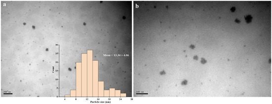 The TEM images of PtNPs are shown in Figure 6. It was confirmed once again that the synthesized PtNPs were monodispersed spherical particles. Only a small number of aggregated nanoparticles were observed in the field of vision, while the average particle size was 13.34 ± 4.06 nm. According to the determination principle, these data were closer to the real particle size of PtNPs in the reaction solution [28].