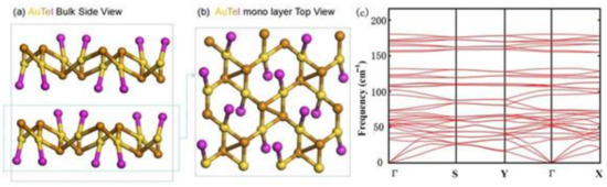 Having confirmed the equilibrium configurations of the 2D AuTeI, we then examine the possibility to exfoliate monolayer AuTeI from the bulk counterpart. First, the feasibility of mechanical exfoliation is investigated based on Equation (1) by calculating the exfoliation energy (Ef), which reflects vdWs interactions strength in the bulk AuTeI phase. The exfoliation energy is defined as the energy cost of peeling the top layer from a surface of a bulk crystal [47]. The lower the formation energy is, the easier monolayer AuTeI can be exfoliated from the bulk phase. The Ef for the cleavage of AuTeI monolayer from the 3D bulk is calculated to be only 15 meV/atom, which is much smaller than that of experimentally successfully peeled graphene (~21 meV/Å2) and phosphorene (~22.7 meV/Å2) [44]. Such small cleavage energy demonstrates the high possibility of mechanically exfoliating the 2D AuTeI monolayer from its bulk phase. The dynamical stability of the AuTeI monolayer is further evaluated by calculating the phonon spectrum under the framework of DFPT. As shown in Figure 1c, there is no imaginary frequency in the phonon spectrum, indicating that single-layer AuTeI is dynamically stable.