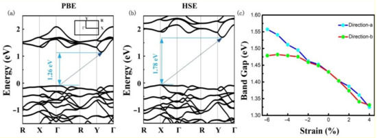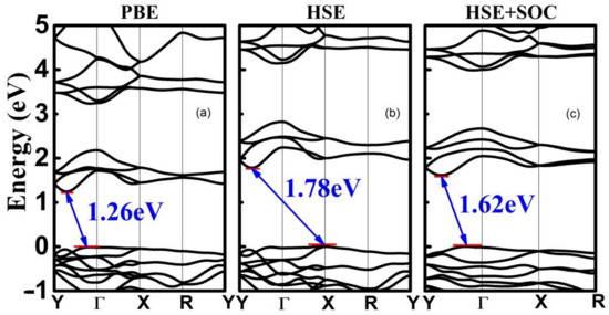 In the following, we will systematically investigate the electronic properties of 2D AuTeI. Figure 2a presents the calculated band structure of 2D AuTeI at the PBE level. The AuTeI monolayer is found to be a semiconductor with an indirect gap of 1.26 eV, like monolayer MoS2, which has been exploited for photocatalytic applications due to its strong absorption in the solar spectrum region [48]. The valance band maximum (VBM) is situated along the wave vector Γ-R, while the conduction band minimum (CBM) locates at a point along the Y-Γ line. It is well known that the bandgap value is underestimated by the PBE functional. Then the HSE calculation is carried out to obtain a more accurate band structure as shown in Figure 2b. The bandgap of single-layer AuTeI is increased from 1.26 eV to 1.78 eV. It should be noted that the overall band dispersion under the HSE functional does not change at all compared to that by the PBE functional. Considering the spin-orbit coupling (SOC), the bandgap is 0.16 eV smaller than the pure HSE calculation shown in Figure 3.
