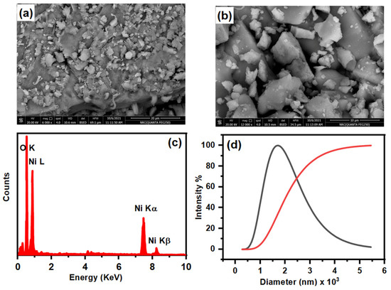(a,b) FE-SEM images (c) Energy Dispersive Spectroscopy (EDS) and (d) Particles size distribution measured by DLS for Ni(OH)2-NC.