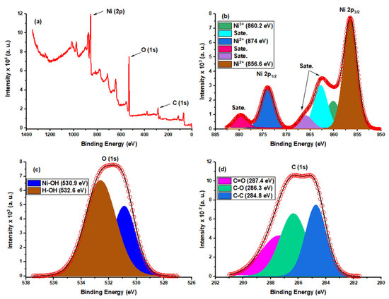 The XPS spectrum of O 1s is shown in Figure 5c. It has a broad peak that The peak at 531.7 eV that can be de-convoluted into two components: the one at 530.9 eV relates to the characteristic oxygen band in (Ni–OH), whereas the peak at 532.6 eV refers to the (–O–H) group of absorbed water molecules (H–OH) on Ni–NP surface, which appears to agree with the previous results of β-Ni(OH)2 [58].