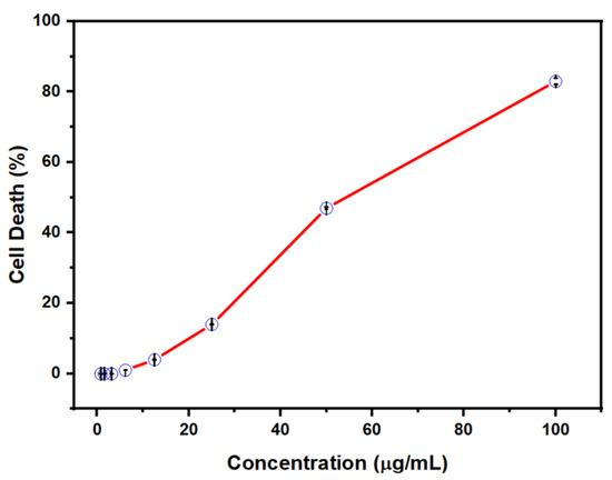 In this work, the human breast cancer cell line MCF7 was used to evaluate the cytotoxicity effect of the bio-synthesized β-Ni(OH)2 using an MTT assay. Figure 6 shows the cell death percentage at different concentrations of β-Ni(OH)2 in the range (1.0–100 μg/mL). The cytotoxic effect of β-Ni(OH)2 is increasing with increasing the concentration of Ni(OH)2 nanocluster indicating a dose-dependent effect on the MCF7 cell line. The IC50 value calculated was 62.7 μg/mL and the maximum cell death was found to be 83.2 at 100 ppm.
