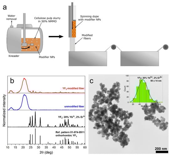 (a) Scheme of the formation of the upconversion cellulose fibers; (b) powder XRD patterns of modifier NPs, and modified and unmodified cellulose fibers; (c) TEM image of YF3 NPs; inset shows size distribution of NPs.
