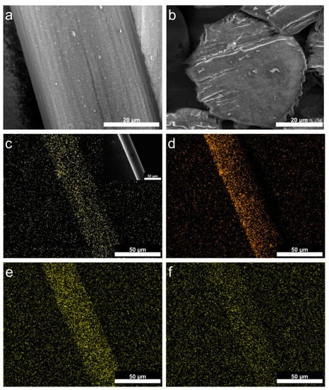 SEM-EDX analysis: (a) SEM images of the fibers surface and (b) cross-section; (c) EDX-mapping of yttrium, (d) fluoride, (e) ytterbium, and (f) erbium; inset presents the field of view.