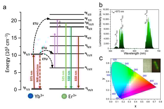 The spectroscopic properties of the fibers modified with YF3: Yb3+, Er3+ NPs are analyzed based on the upconversion (UC) emission spectra, recorded at λex = 975 nm. In this system, Yb3+ ions act as sensitizers (light-harvesting ions), which absorb near-infrared (NIR) energy and transfer it to the nearest emitting Er3+ activator ions via the energy transfer upconversion (ETU) mechanism (Figure 3a). The emission spectra of the modified fibers shown in Figure 3b consist of three characteristic, narrow bands from Er3+ associated with their 4f-4f radiative transitions, i.e., 2H11/2→4I15/2 (525 nm), 4S3/2→4I15/2 (550 nm), and 4F9/2→4I15/2 (650 nm). The effective color of the luminescence of the YF3-modified fibers is determined using the chromaticity coordinates (CIE 1931) calculated based on the recorded emission spectra and it is established as greenish (Figure 3c). This result is consistent with the bright green emission of a knitted fabric (made of YF3-modified fibers) excited by NIR irradiation observed with the naked eye (inset of the Figure 3c).