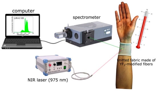 In order to demonstrate the potential use of modified fibers as a wearable temperature sensor, a knitted fabric made of these fibers is used to determine the temperature of human skin. The measurement is carried out on the inner side of the volunteer’s forearm wrapped in the knitted fabric (Figure 5). Based on the obtained LIR value (LIR = 0.120), the forearm skin temperature is measured to be 35.3 °C, which is consistent with the temperature measured with a traditional thermometer. Please note that temperature of the forearm skin is lower than the axillary (underarm) or oral temperature (~36.6 °C) [51]. It should be emphasized that, in this case, the applied laser power density is significantly lower than in the case of the YF3-modified fibers, which proves that it is possible to obtain reliable results even with the use of such low laser power densities, which is a very important factor in the case of real applications, e.g., biological or industrial processes, where the use of high-power lasers is usual.