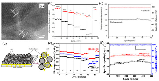 Due to the limited improvement in the poor electrical conductivity of LiFePO4 coated with graphene by a co-precipitation method, Zhou et al. [43] reported a spray-drying and annealing method to prepare LiFePO4 coated with both graphene and glucose-derived amorphous carbon. The LiFePO4 particles were coated with a uniform graphene layer with a 3D network, which enabled fast migration of electrons and Li-ions. This result indicated that LiFePO4 coated with graphene and carbon has a better rate capability and cycle stability. They explained that the glucose-derived amorphous carbon prevented the stacking of graphene sheets, reducing the anisotropy of electronic migration in the graphene layer and accelerating the Li-ions diffusion through the defects in the graphene sheets. Similarly, Jiang et al. [46] demonstrated the addition of rGO could bridge the carbon-coated LiFePO4 nanoparticles (as shown in Figure 2d), improving the homogeneity of the carbon layer and speeding up electrons transfer. The results showed that the rate performance, cycle stability and specific capacity of LiFePO4 with carbon-rGO all were get improvements remarkably. In the mutual effect of carbon and rGO, the discharge capacity of LiFePO4 with carbon-rGO reached 148.3 mAh g−1, which was higher than that of carbon-coated LiFePO4 (Figure 2e). In addition, no capacity fading of LiFePO4 with carbon-rGO was found at the rate of 10 °C in room temperature after 200 cycles (Figure 2f).