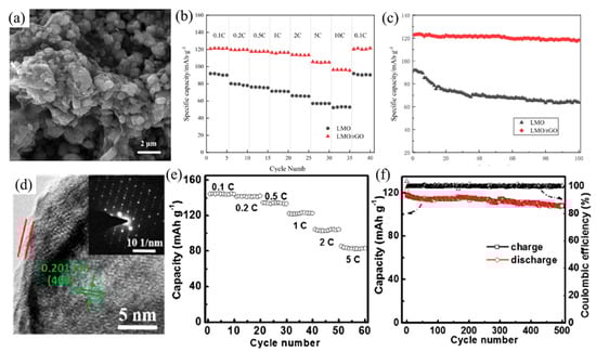 (a) The SEM images of LiMn2O4/rGO; (b) discharge rate capability at different current densities; (c) cycling performance curve of LiMn2O4 and LiMn2O4/rGO at 0.2 C (Reprinted with permission from Ref. [54]. Copyright 2020 Springer Nature). (d) The HRTEM diagram of LiMn2O4 with 10 wt% carbon; (e) rate capability under variable current rate; (f) cycling performances of LiMn2O4 with 10 wt% carbon at 1 C (Reprinted with permission from Ref. [31]. Copyright 2018 Elsevier).