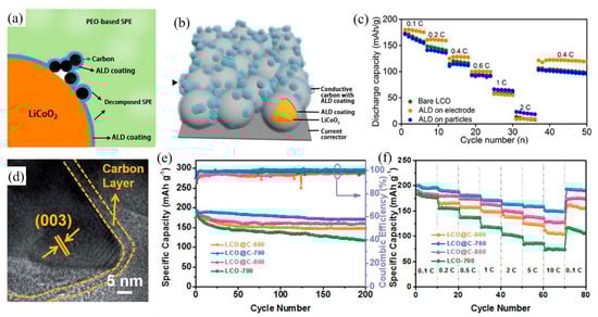 Wang et al. [70] showed that graphene nanosheets with small size can coat the surface of LiCoO2 with a homogenous distribution and without much aggregation, accelerating the transport of electrons and diffusion of Li-ions due to the high electronic conductivity of the graphene network. Nanoscale graphene particles have a high specific surface area and excellent electronic and ionic conductivities. Sun et al. [71] reported that LiCoO2 coated with graphene quantum dots by a simple liquid phase approach showed a better cycle stability without the presence of micro-cracks. Luo et al. [74] developed LiCoO2 coated with highly aligned CNTs to create a three-dimensional conductive network through a ultrasonication and co-deposition method. The material exhibited good electronic conductivity, high flexibility, high energy density and excellent cycle stability. Liang et al. [73] suggested that atomic layer deposition was an alternative technique to coat carbon on the surface of LiCoO2 because atom layer deposition enables accurate control over the thickness of the carbon layer, and it forms a uniform, conformal and thin carbon film (Figure 4a,b). Figure 4a,b showed the schematic diagram of LiCoO2 particles and electrode coated by conductive carbon with ALD coating method, respectively. They found that the capacity rate of LiCoO2 electrode coated by carbon was remarkably improved at low current density (<0.6 C), while the LiCoO2 particles coating achieved the higher capacity at the high current density (Figure 4c). Besides, the most important benefit is that the process uses a relatively low temperature, hence this method would not damage the structure of the carbon and electrode during the preparation. Recently, Lin et al. [72] provided a new strategy of in situ constructing MOF-derived to prepare LiCoO2 with carbon-coated core-shell structure by elevated-temperature solid-state annealing. Through several annealing temperature comparison, they found carbon-coated LiCoO2 formed in the annealing temperature of 700 °C (Figure 4d) could exhibit the superior electrochemical performance. Figure 4e,f showed the carbon-coated LiCoO2 synthesized by the 700 °C annealing temperature has the capacity retention of 89.1% at the current density of 1 C after 200 cycles and the discharge capacity of 193.4 mAh g−1 at the current rate of 0.1 C.