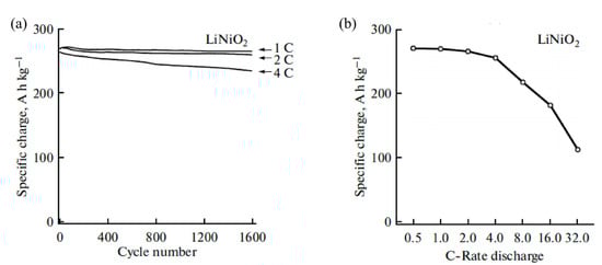(a) Electrochemical specific charge of LiNiO2; and (b) dependence of the specific charge of LiNiO2 (Reprinted with permission from Ref. [79]. Copyright 2015 Springer Nature).