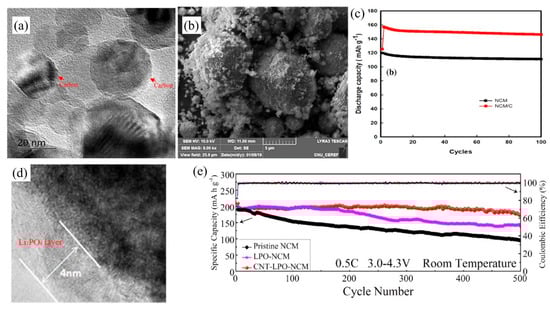 (a) TEM images of the NCM coated with carbon layer; (b) FE-SEM images of the NCM/C powder; and (c) discharge capacity of the NCM/C-based LIB (Reprinted with permission from Ref. [93]. Copyright 2020 Springer Nature). (d,e) TEM images of the CNT-LPO-NCM; and cycling performances of pristine NCM, LPO-NCM and CNT-LPO-NCM at 0.5 C separately in the voltage range of 3.0–4.3 V (Reprinted with permission from Ref. [87]. Copyright 2019 American Chemical Society).