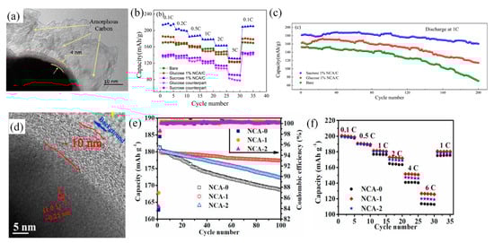 On the other hand, in the high temperature process, glucose and sucrose are not suitable as the carbon coating sources due to the generation of H2O and CO2 from carbon, which would damage the structure of the cathode. Thus, Feng et al. [107] proposed using polyacrylonitrile (PAN) as the carbon coating source, which successfully formed a continuous carbon coating layer on the surface of NCA (Figure 7d). Although, NCA-2 (8.0 wt% content of PAN solution) possessed the highest initial discharge capacity of 181.2 mAh g−1, while the NCA-1 (4.0 wt% content of PAN solution) exhibited the highest capacity retention of 98.4% under 1 C current density after 100 cycles (Figure 7e) and the highest capacities at different rates (Figure 7f). The results showed a significant improvement of the electrochemical performance, including the restraint between NCA electrode and environment moisture conditions and the promotion of interfacial dynamics of cathode/electrolyte. The further relationship between carbon content and final electrochemical performance was confirmed.