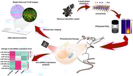 Unlike other members of the TMD family such as MoS2 and WS2, a new member rhenium disulfide (ReS2) is unusual, because its crystal structure has significant anisotropy. Moreover, functional ReS2 nanosheets have great potential for biomedical studies due to their strong NIR absorption and high PTCE. Generally, functional ReS2 nanosheets can be prepared by both bottom-up and top-down methods. For example, using the bottom-up method, Shen et al. [] prepared uniform ReS2 nanosheets that were employed for cancer photothermal radiotherapy, while Miao et al. [] constructed colloidal ReS2 nanosheets to guide cancer photoacoustic/CT imaging and PTT using a liquid-phase exfoliation approach. Although both cell and animal experimental data have demonstrated the low toxicity of 2D ReS2 nanosheets, their potential toxicity in humans remains unclear. Hematoxylin and eosin (H&E) staining of tumor and five major organ slices, including the heart, liver, spleen, lung, and kidney, can be employed to determine the therapeutic outcomes and materials’ toxicity [,]. The evaluation of H&E stained tissue sections is a standard in clinical diagnosis, but limited in quantitative analysis. Thus, it is critical to develop a novel method to evaluate the cancer therapy efficiency of functional 2D materials. Circulating microRNAs (miRNAs) are important blood-based cancer biomarkers that could be used to evaluate cancer therapy efficiency [,]. Generally, miRNAs are potential oncogenes or tumor suppressors, and changes in miRNA expression are highly correlated with the emergence of cancer. Thus, miRNAs have been considered to be an important molecular tool for performing non-invasive cancer prognosis. By observing changes in the expression of blood circulating miRNAs before and after PTT, the therapeutic outcomes can be determined. To the best of our knowledge, no studies have reported the use of miRNA expression to characterize the therapeutic outcomes of the nanoagent-based PTT.