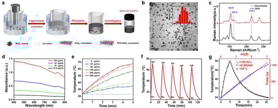 Transmission electron microscopy (TEM) imaging of the PEG-ReS2 nanosheets was performed using a transmission electron microscope (JEM-1230 CX, JEOL Ltd., Tokyo Japan). In addition, the Vis-NIR absorption spectra of PEG-ReS2 nanosheets ranging from 400 nm to 900 nm were acquired using a UV-VIS spectrophotometer (UV-1780, SHIMADZU, Kyoto, Japan). Under the excitation of a 785 nm laser, the Raman spectra of the PEG-ReS2 nanosheets and bulk ReS2 crystals were measured by a confocal Raman spectrometer (Renishaw, inVia, London, UK).