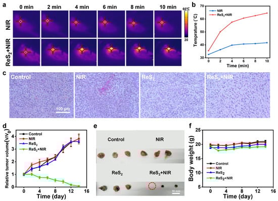 In vivo photothermal therapy. (a) Infrared thermal images of tumor-bearing mice injected with PBS and PEG-ReS2, respectively. The power density of the 808 nm laser was 0.5 W/cm2, and the irradiation time was 10 min. (b) The temperature curves at the tumor site according to Figure 4a. (c) Representative images of the H&E-stained tumor slices from four experimental groups one day after PTT treatment. (d) After PTT, the relative tumor volume of tumor-bearing mice was measured in the four experimental groups (8 mice in each group) every two days. (e) At day 14, tumors were obtained from three randomly selected mice from each group for comparison. Tumors in the ReS2 + NIR group were ablated, while tumors in the other groups were still large in size. (f) The body weight of the tumor-bearing mice from four experimental groups was measured.