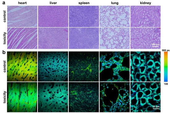 Next, we confirmed low in vivo toxicity of PEG-ReS2 nanosheets through the intravenous injection method. Two healthy BALB/c mice were injected with 100 μL PEG-ReS2 nanosheets (6 mg/mL in water) via the tail vein. Two months later, the PEG-ReS2 nanosheets were found to accumulate in the major organs via blood circulation. However, H&E staining revealed no significant organ damage or visible inflammation due to the accumulation of PEG-ReS2 nanosheets (Figure 5a). Moreover, changes in the tissue and cells’ microenvironment were examined by extracting fluorescence lifetime changes by FLIM [] (Figure 5b). No obvious differences in the lifetime distributions of the control group and toxicity group were observed, further highlighting the low In vivo toxicity of PEG-ReS2 nanosheets.