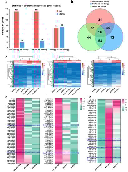 miRNA expression analysis. (a) Statistical analysis of differentially expressed genes (DEGs) from non-therapy vs. healthy group, therapy vs. healthy group, and therapy vs. non-therapy group, respectively. (b) Plot showing the differentially expressed genes from two different groups in the non-therapy group, therapy group, and healthy group. (c) DEGs cluster heatmaps showing healthy group vs. non-therapy group, therapy group vs. non-therapy group, and healthy group vs. therapy group, respectively. (d) The down-regulated miRNAs caused by PEG-ReS2-based PTT in non-therapy group, therapy group, and healthy group, respectively. (e) The up-regulated miRNAs caused by PEG-ReS2-based PTT in non-therapy group, therapy group, and healthy group, respectively.
