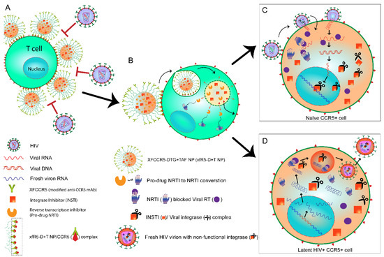 Schematic diagram explaining the dual-action strategy of targeted cARV-nanoformulation. (A) The first level of protection: Anti-CCR5 mAb+ ARVs loaded NP bound on the T-cell surface via CCR5 receptor (xfR5-D+T NP/CCR5 complex) blocks HIV interaction with CCR5 on the T-cell surface by two approaches, i.e., first, by blocking HIV from CCR5 binding and the second, providing steric hindrance to HIV virions due to nanoformulation crowding on T-cell surface (red block arrows) [30]. (B) The xfR5 D+T NP/CCR5 complex triggers the CCR5 trafficking pathway due to anti-CCR5 mAb binding with the CCR5+ T-cells [31], leading to the internalization of xfR5 D+T NP. Within the endosome, the low pH induces the degradation of polymeric NPs, leading to the release of DTG (INSTI)and TAF (NRTI) into the cytoplasm. The second level of protection: the presence of an intercellular pool of TFV di-phosphates and DTG to prevent (C) naive cell HIV infection. (D) The latently HIV+ cells with free intracellular high-affinity DTG (INSTI), will bind with fresh integrase enzymes produced during the reactivation stage, resulting in a non-functional INSTI/integrase complex; therefore, fresh HIV virions thus produced will be with non-functional INSTIs, and, fresh virion will not be able to integrate viral DNA into the host genome.