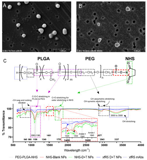 Representative scanning electron microscopic image of NHS-D+T NP (A) and xfR5 D+T NP (B). (C) Representative FT-IR spectrum obtained from PEG-PLGA-NHS polymer, NHS functionalized NPs (NHS-Blank NPs), NHS functionalized D+T NPs (NHS-D+T NPs), xfR5 D+T NPs, and xfR5 mAbs. The significant functional group bands are presented in various color boxes (Orange: –CH wag and rocking vibration band (840–900 cm−1); Purple: C-O-C stretching bands (1095–1198 cm−1); Red: amide bond; Green: C=O stretching band (1695–1818 cm−1); Red: –CON– stretching based on reported FT-IR spectral studies [46,47]). Inset graph enlargement image (C) shows NH–band shifting from 1450 cm−1 to 1420 cm−1 indicating COO–NC bond conversion to amide bond (–CONH–); and the presence of Amide I and II at 1540 cm−1 and 1640 cm−1, respectively.