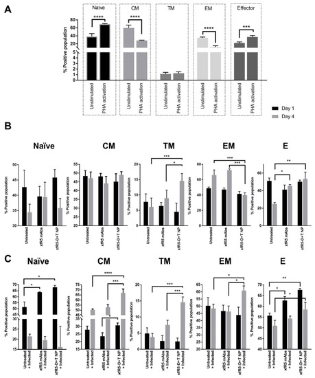 The immunological potential of targeted ARV-loaded nanoformulation was evaluated on the PBMCs isolated from healthy donors. The immune-differentiation pattern of T-cells during prophylaxis application and HIV treatment were evaluated using flow cytometry after treating uninfected hPBMCs with xfR5-D+T NP or xfR5 mAb, along with respective controls. The gating strategy for the immunophenotypic study is described in Supplementary Figure S4. Based on the expression level of CCR7, CD27, and CD45RO receptors on T-cells, five distinct T-cell subpopulations were determined, i.e., naïve cells (CCR7+ CD27+ CD45RO−), central memory cells (CM, CCR7+ CD27+ CD45RO+), transition memory cells (TM, CCR7− CD27+ CD45RO+), effector memory cells (EM, CCR7− CD27− CD45RO+), and effector cells (CCR7− CD27− CD45RO−). The immunophenotype of the T-cell populations was determined over different time points and conditions. The time point considered were (i) day before phytohemagglutinin (PHA) activation (unstimulated T-cell population); (ii) PHA-activation (one day after PHA-activation); (iii) HIV infection (one day after HIV infection); as well as (iv) one and four days after xfR5-D+T NP or xfR5 mAb treatment (Figure 3).