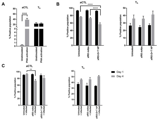 Effects on effector (E T-cell) phenotype upon treatment (with xfR5-D+T NP and xfR5 mAbs) compared to untreated conditions during PrEP and HIV-1 infection. (A) Comparative effect on aCTL (CD8+ E T-cell) and Th (CD4+ E T-cell) phenotype under unstimulated and stimulated (PHA-activated). (B) Under HIV challenge condition: aCTL (left graph) and Th (right graph) population on day 1 (black bar) and day 4 (gray bar). (C) The treatment effect in the presence of HIV-1 infection, on aCTL (left graph) and Th (right graph) on day 1, and day 4. Each data set represents the mean ± SEM of three independent experiments on PBMCs obtained from 3 healthy donors (n = 3). The gating strategy for this study has been explained in Supplementary Figure S4. The significance is represented as the asterisk (*) symbol, where ‘**’ and ‘****’ correspond to p values <0.01 and <0.0001, respectively.