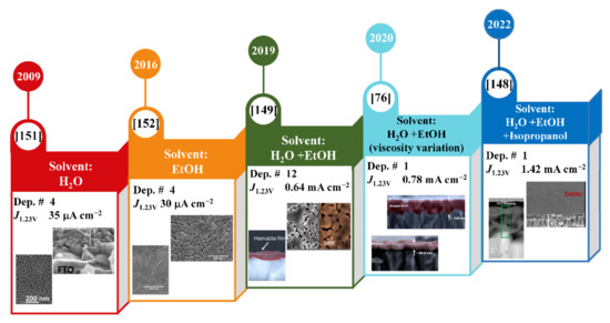 Timeline of significant breakthroughs in the synthesis of spin-coated hematite photoanodes by the polymeric precursor method from 2009 to 2022. The deposition number is represented by Dep #, and the J1.23V represents the photocurrent density obtained at 1.23 V vs. reversible hydrogen electrode (RHE). Reprinted from Reference [151], Copyright 2009; Reference [152], Copyright 2016; Reference [149], Copyright 2019; Reference [76], Copyright 2020; Reference [148], Copyright 2022, with permission from Elsevier.