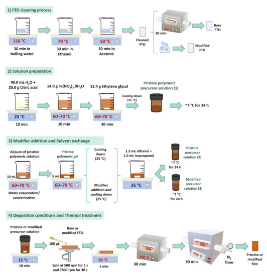 The first and most essential step involves the FTO cleaning process (1), which removes any surface impurities. The as-cleaned substrate is directly used in some syntheses, such as hydrothermal. However, the compact film formed by the PP synthesis is more susceptible to poor adherence on the inhomogeneous FTO surface. Better surface uniformity was obtained when the substrate was subjected to thermal treatment, improving the interaction of the polymeric solution further deposited. Therefore, a 1 h thermal treatment at 550 °C is adopted for the cleaned substrates (bare FTO), except when it is desirable to cover it with an underlayer (modified FTO), because the underlayer covering from simple methodologies usually involves a thermal treatment. A typical PP solution preparation (2) begins with the dissolution of citric acid in the solvent, which is optimized as water for the hematite synthesis. Then, a metal precursor is added in the 1:3 ratio of citric acid. After complete homogenization, the system is heated at 60–70 °C, and ethylene glycol is added to initiate the polymerization. A pristine polymeric stock solution is obtained after 30 min and can be directly used to prepare hematite films, or a concentration step can be performed. By reducing 50% of the initial volume, a pristine polymeric gel is obtained, in which modifier incorporation can be achieved with a rapid homogenization. The pristine or modified polymeric gel is allowed to cool down to 25 °C, at which point a viscosity adjustment is made by adding ethanol and isopropanol (1.5:1). The resulting pristine or modified precursor solutions need to be stored (in a refrigerator, 7 °C) for at least 24 h before use to obtain reproducible films. The spin-coating deposition (3) from 100 µL of the precursor solution and rotation conditions of 500 rpm for 5 s and 7000 rpm for 30 s ensure uniform coverage for solutions with different viscosities. A mild drying in a hot plate initiates the solvent evaporation and film adhesion to the substrate, which is completed in the following air thermal treatment, at 550 °C; this eliminates the polymeric chain and promotes the crystallization of the nanostructured oxide. The hematite film is then treated in a nitrogen atmosphere at 750 °C to activate it for PEC applications.