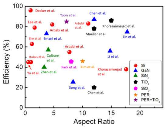 Aspect ratio versus efficiency of metasurfaces based on different materials. The materials silicon (Si) [37,73,74,75,76,77,78,79,80], gallium nitride (GaN) [54,63,73,74,81], silicon nitride (SiNx) [75,76], titanium oxide (TiO2) [77,78,79], silicon oxide (SiO2) [80], polymer resin (PER) [82], and PER doping with TiO2 [83] are marked with red dots, blue triangles, green triangles, black pentagons, pink pentagon, orange star, and purple stars, respectively.
