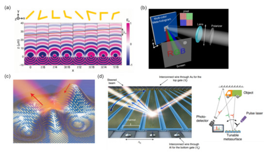 (a) Finite-difference time-domain simulations of the scattered electric field with V-antenna arrays [101]. (b) Illustration of the multicolor metahologram [102]. (c) Schematic of a metasurface skin cloak [103]. (d) Illustration of 3D LiDAR composed of a metasurface and electrically tunable channels [110].