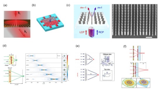 (a) Beam deflection metasurface [122]. (b) Phase distribution of an optical vortex metasurface [125]. (c) Schematic (left) of a-Si grating that redirects impinging light based on its handedness; SEM image (right) of a-Si grating with a scale bar of 1 µm [126]. (d) Schematic of a dielectric metalens with a tunable focal distance (left); measured optical intensity profiles of a tunable metalens (right) [136]. (e) Polarization-controlled focusing metalens [137]. (f) Tunable lens that consists of a stationary lens on a substrate and a moving lens on a membrane [138].