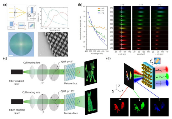 Figure 4c,d [77,167] provides examples of the multifunctionality of a TiO2 metasurface. Mueller et al. used both the geometric and propagation phases to design a hologram and used dual channels in arbitrary orthogonal polarization states. More channels of the incident polarization were changed to produce two patterns. Hu et al. used three channels to produce a trichromatic holographic film. Through the optimization of different wavelengths and polarizations, wavelength multiplexing was demonstrated.