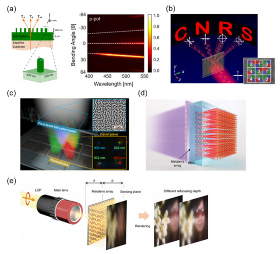 (a) Schematic of a metasurface (left); measured energy distribution of the metasurface illuminated by the p-polarized light (right) [81]. (b) Multidirectional metahologram; SEM image is shown in the inset [54]. (c) Multicolor router with a dielectric metalens in a CMOS image sensor [73]. (d) Quantum light source based on a metalens array [74]. (e) Light-field imaging application with a metalens array [63].