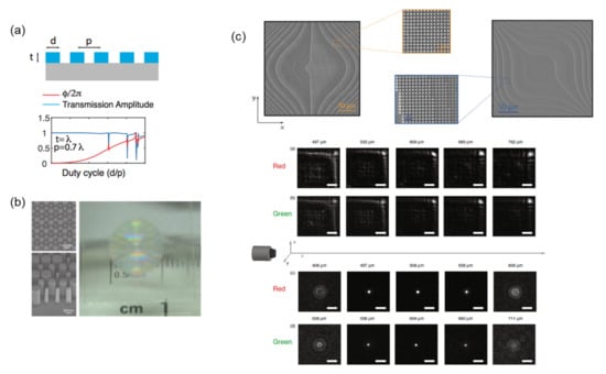 (a) Grating structures (top) with periodicity p can be formed by using cylindrical posts (with diameter d) arranged in a square lattice. The thickness of the grating is denoted as t. The thickness t was λ, and periodicity p was 0.7 λ [75]. (b) Top-view SEM image (left) of a portion of the fabricated micrometalens with the grating constructed using a low-refractive-index SiNx metalens with circular nanopillars on a fused silica substrate. The hexagonal lattice constant is a = 416 nm, and the thickness of nanopillars is 695 nm. Photograph (right) of the macroscopic metalens with a focal length of −4 mm [181]. (c) SEM images of half of the Alvarez lens (upper left), the cubic phase plate coated in gold (upper right), PSFs of the cubic element under coherent illumination using red and green light (top middle), and PSFs of a 500-μm metasurface lens under red and green illumination (bottom middle) [182].
